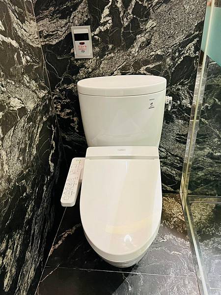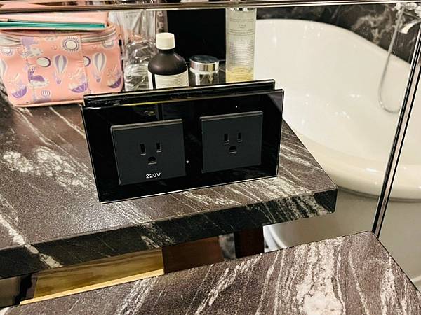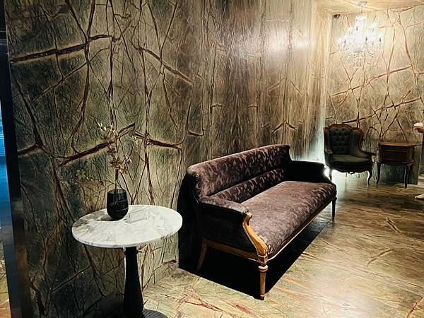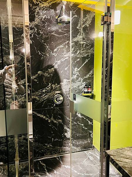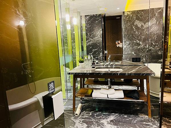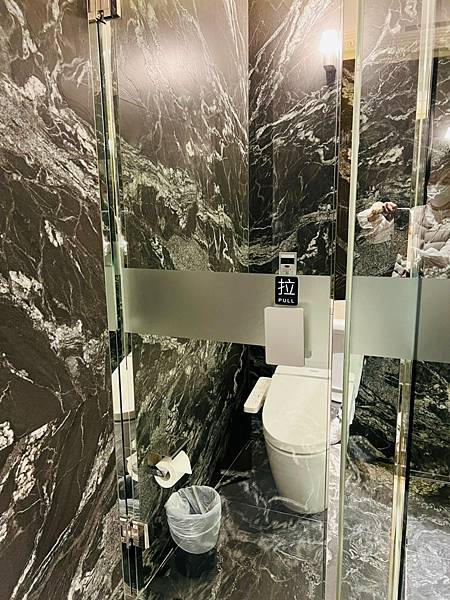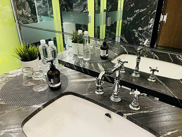 黑灰紋路的大理石洗手枱和牆面看來很高級