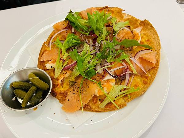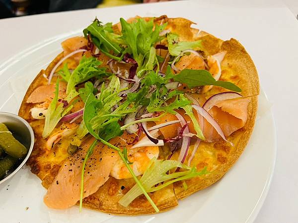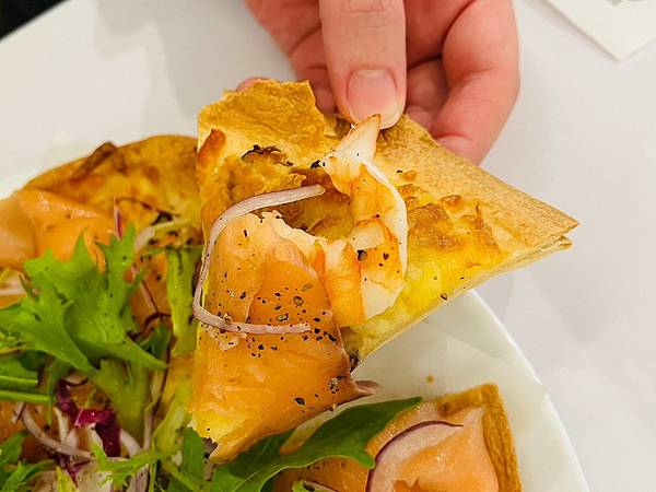 舖上起司的薄餅烤的邊緣酥脆,再放上配料