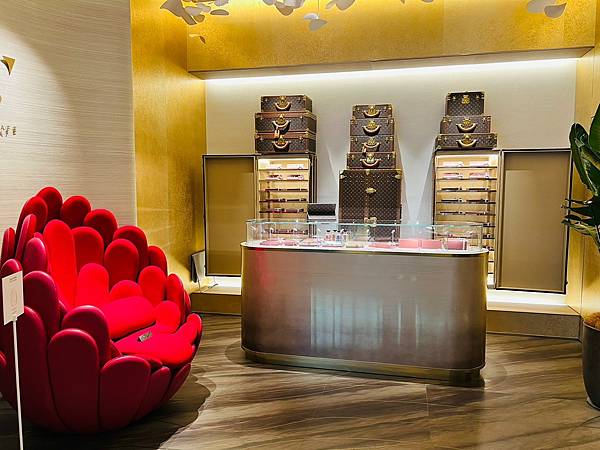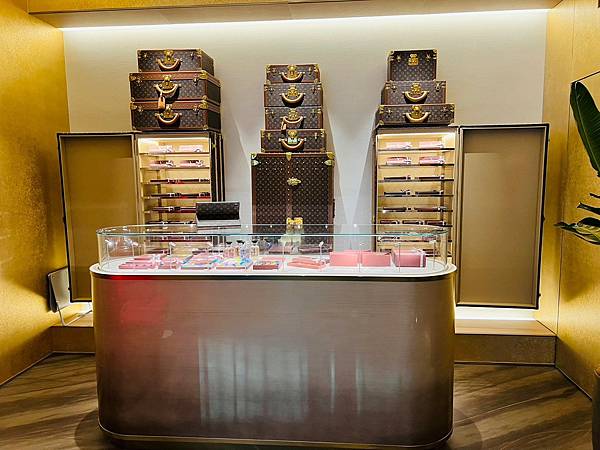 櫃枱後面就有很多老花行李箱當背景,很LV氛圍