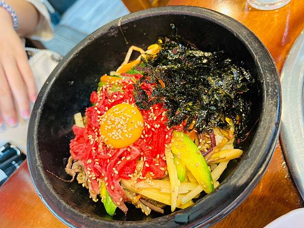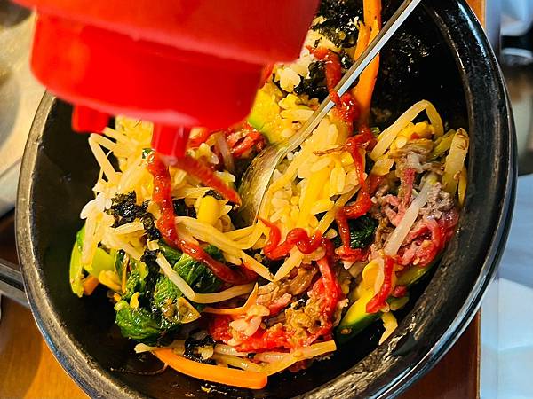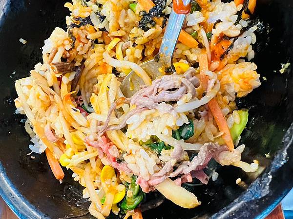 點石鍋拌飯最保險,如果不敢吃那麼多生牛肉的話還可以拌一拌,