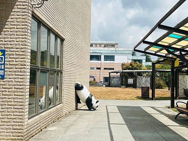回來才看到一樓的停車場出入口旁有隻可愛的熊貓正在倒立😆