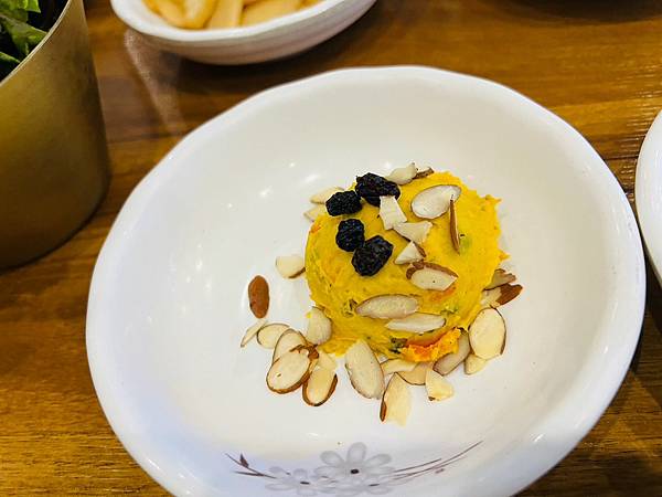 上面撒了杏仁片的南瓜泥,很香很甜,沒有南瓜的生味