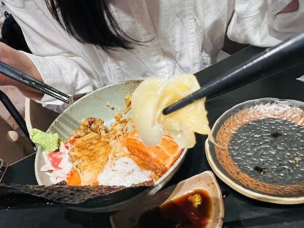 丼飯底下是有熱度且淋有微甜醬汁的白飯