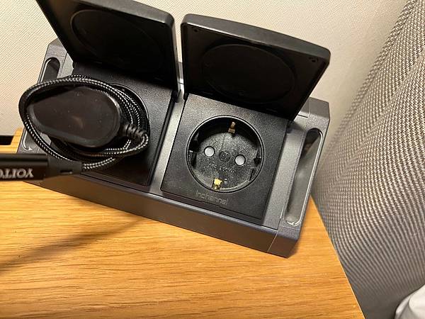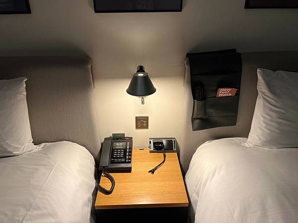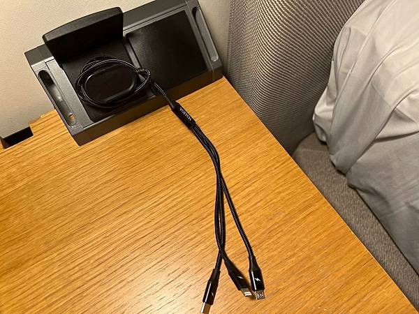 中間的床頭櫃有各式充電線,也有需要轉接頭的插座