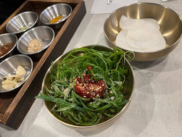吃烤牛肉一定要有的蔥絲,一定加他們家自己調的辣椒醬