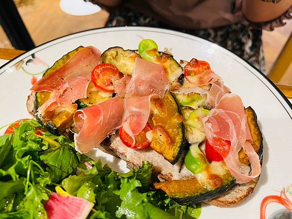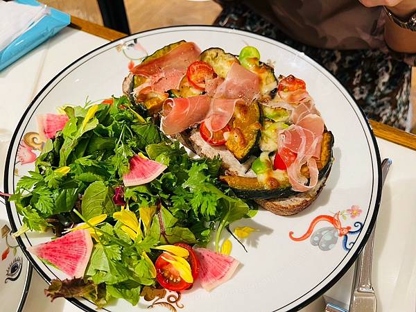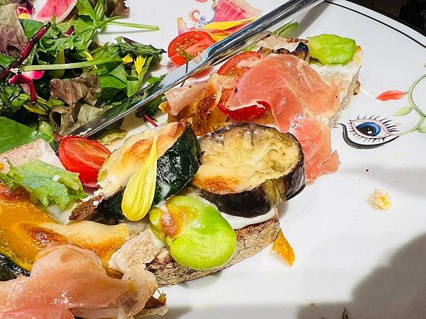 上面鋪了鹹香的生火腿,底層的酸種麵包外酥內柔軟