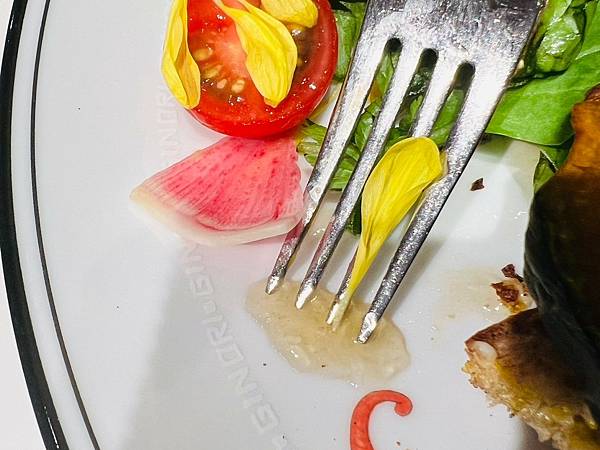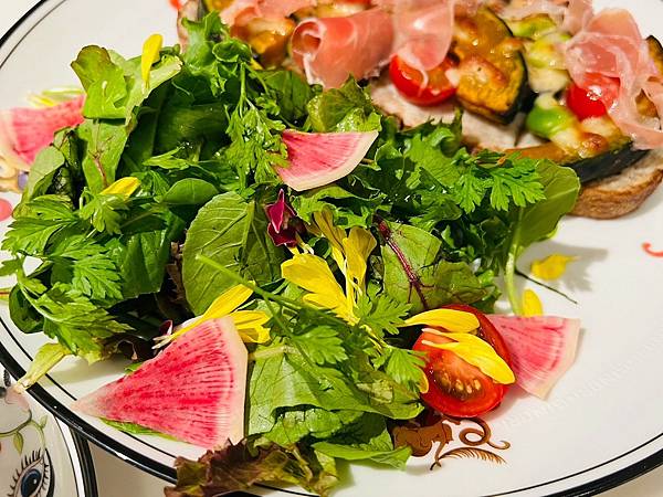 旁邊生菜沙拉用花瓣點綴也十分有美感