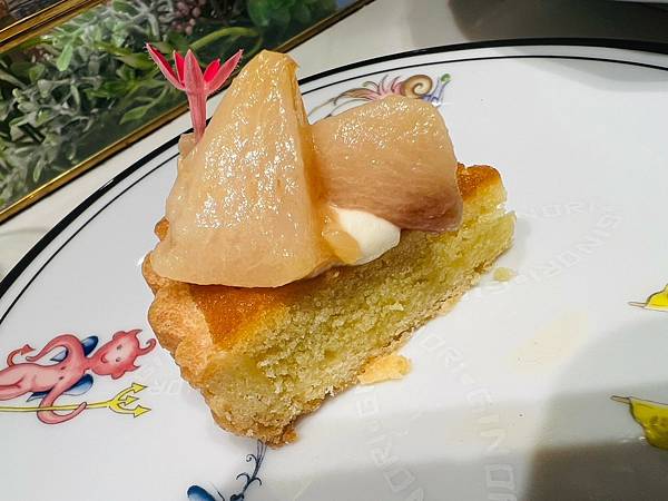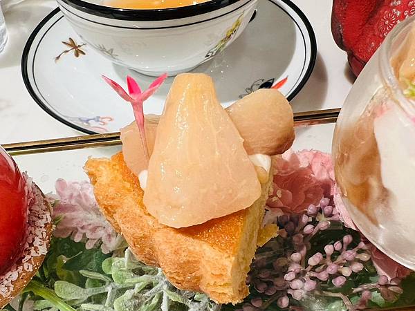 中間的是水蜜桃塔,厚厚的塔皮吃起來的口感類似磅蛋糕,偏甜
