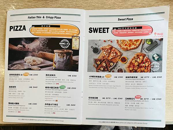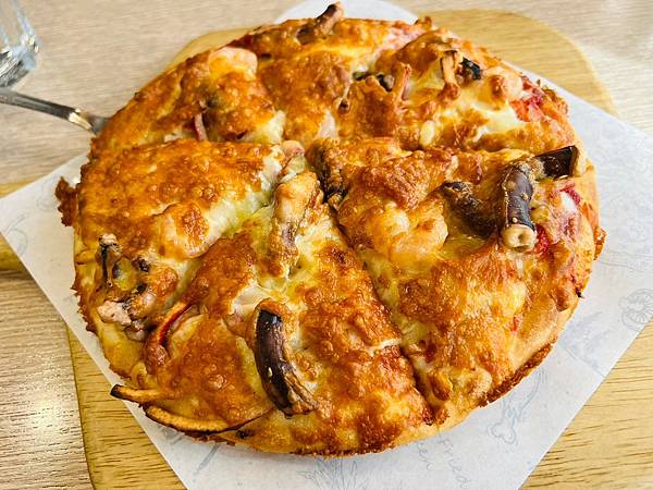 披薩的起司鋪得厚又滿,表層烤得很香脆